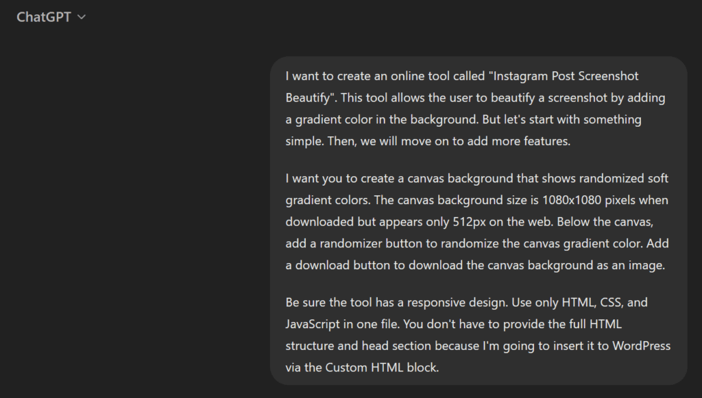 In this post, we’ll walk through the process of creating an “Instagram Post Screenshot Generator” using just a few ChatGPT prompts. But you can adapt it to any tool that you want to create. The concept is the same.
