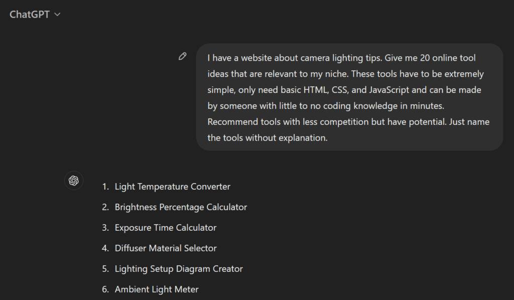 The first step is to come up with an idea for a simple online tool that would be valuable for your website’s niche or topic. You can ask ChatGPT for inspiration by providing a prompt like: