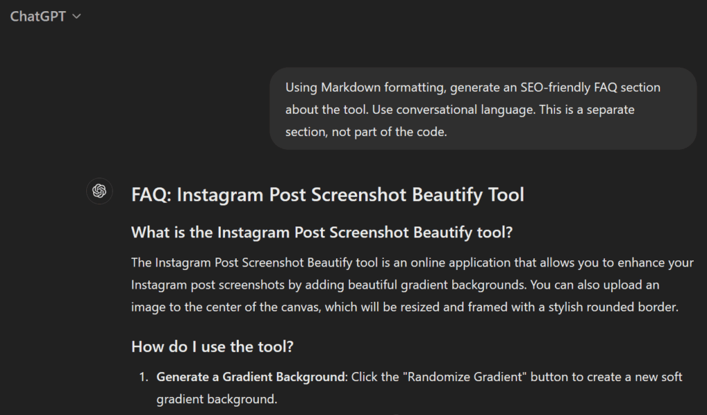 Finally, to help your tool rank well in search engines, ask ChatGPT to generate an FAQ section that you can add below the tool on your WordPress page: