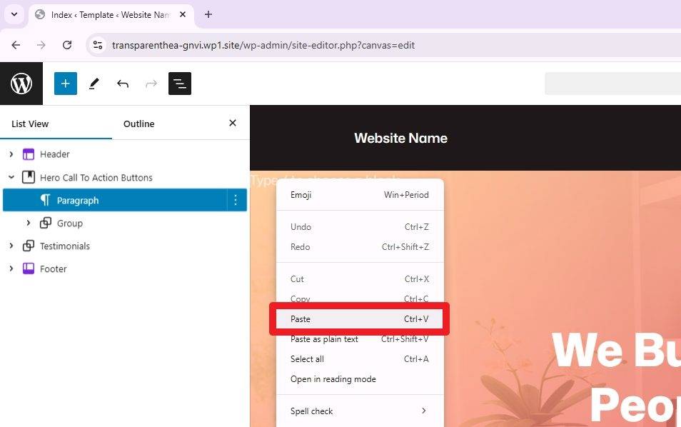 On the new block (Paragraph block) that we just added before, you can Paste the Header content onto it.