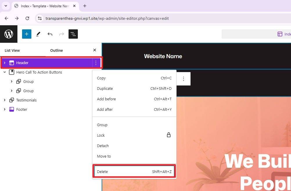 You will see that there are two headers, the main reusable Header (in purple) is the one that we need to remove. Right-click on it and select Delete.