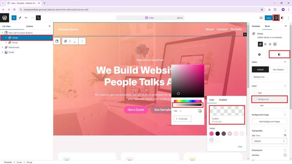 Now, we need to make the new Header body transparent. To do that, select the new header Group block, open Settings > Styles > Background > Color, and then set the transparency level to maximum.