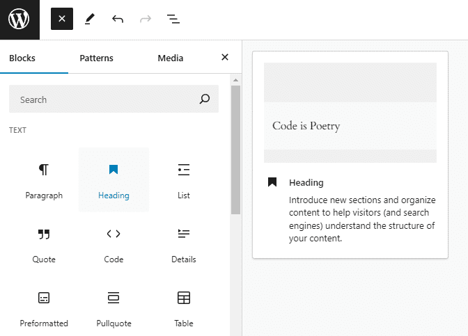 From here, you can browse all available blocks, search for specific ones, or even access your reusable blocks.